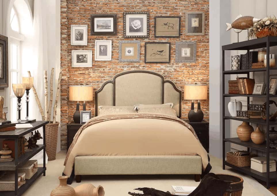 The beige sheets of the traditional bed larn good amongst the lite grayness cushioned headboard that stands out against the crimson brick wall behind it that is adorned amongst multiple framed photos together with artworks. This is paired good amongst the shelves on either side of the bed that is filled amongst decors.